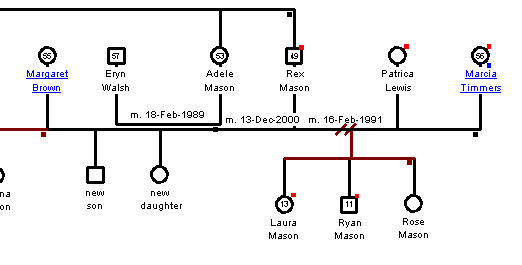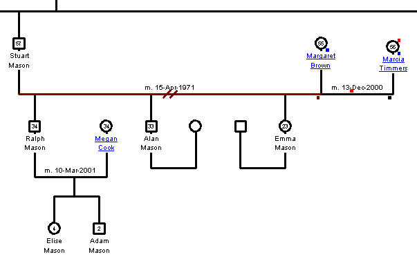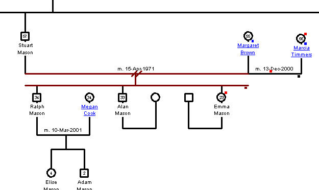 This leads to the auto layout issue I have. If you add a new son and a new daughter to the marriage of Stuart & Marcia the layout becomes almost impossible to follow as the connectiones are directly over the connections between Rex and Patricia, as below.