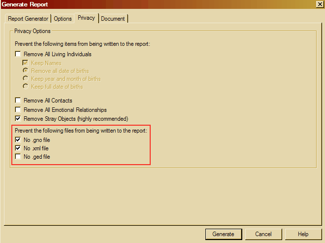 appleshaw (8/2/2006) However there is no GenoPro link, only the .svg link, because this version will not write Familytrees.gno. Writing to the hard disc, it does produce Familytrees.xml which imports to show the correct original links.In the Report Generator dialogue, the default option under the Privacy tab is to not generate the .gno file:
