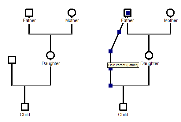 Then, delete the "fictious father" of the child. Select the genuine father, right-click and pick the menu item Link as Parent. Move the mouse over the family of the the child. Voilà.
