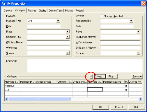 A couple gets married in the civil court, then they get married in the church and then they divorce. This means three lines in the marriage dialog box. The report does not give a proper sequence of events...