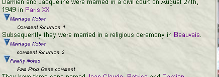 jcguasp (8/15/2006) With b17i, the comments/notes are reported, as shown (even the gene comment)I agree the comments appear in the report, but they relate to each marriage. Regarding your last point, this is not a bug. I believe this is a bug, otherwise the option to change the order of marriages would not exist (the order can be by importance rather than date). 2) perhaps, easier to do than 1) above, the "Subsequently" word could be changed into "In addition, Additionally, Also, Further, Furthermore, ... This is a good suggestion which would accomodate all eventualities.