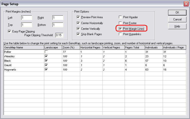 margin lines are there We are all limited by the size of a printed page , usually A4 or Foolscap. If you are trying to print a large family onto a small page, you will always have a very small type font, and Family lines to match. Genopro allows you to separate large Families into smaller groups. This allows me to print out my tree on 750 genomaps that are all clear to read. It may not be what you want to achieve, but it is more convenient than to use large printing formats generated by commercial operators, or squinting to read small print on standard pages.